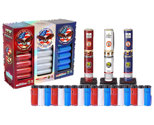 18 Shot. 5", 60 Gram canisters, reloadable artillery with 3 tubes. Red, White and Blue Themed.