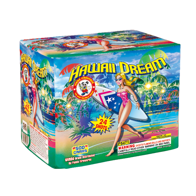Say "Aloha" to palm trees with big silver, green, orange and purple tiger tails. Grand crackling willow finale makes this a Maui Wowie!! Unique effect with varied firing pattern.